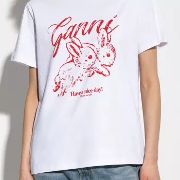 Ganni Organic Cotton White T-Shirt with Red Rabbit Print